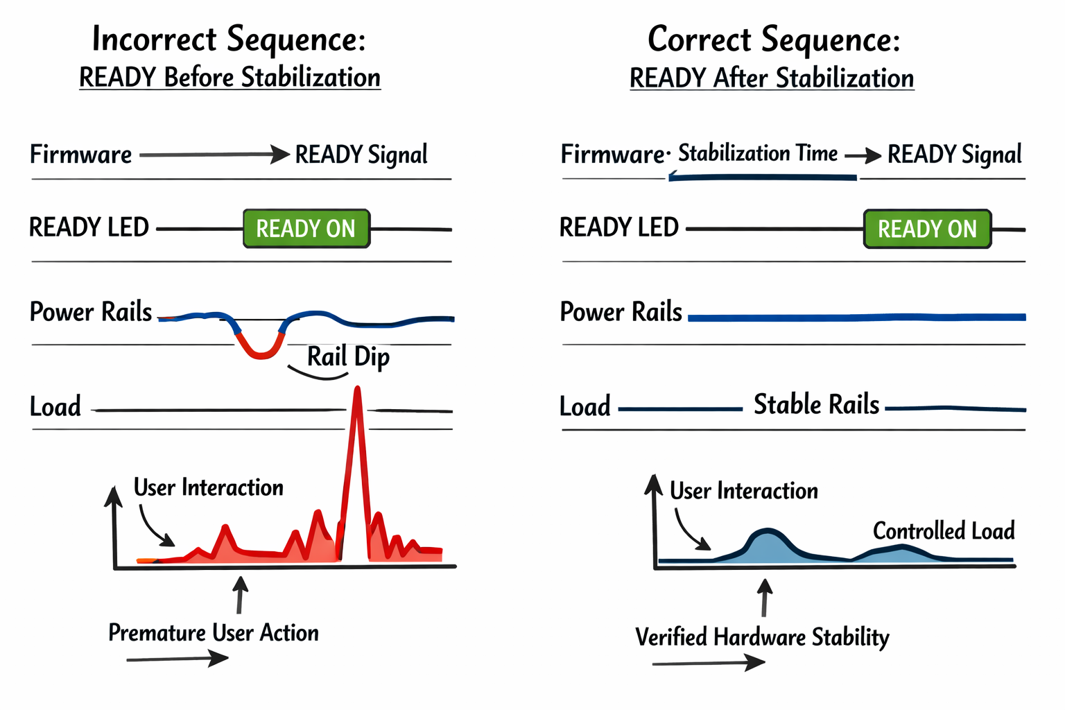 Firmware sets LED “ready” before hardware actually stabilizes.