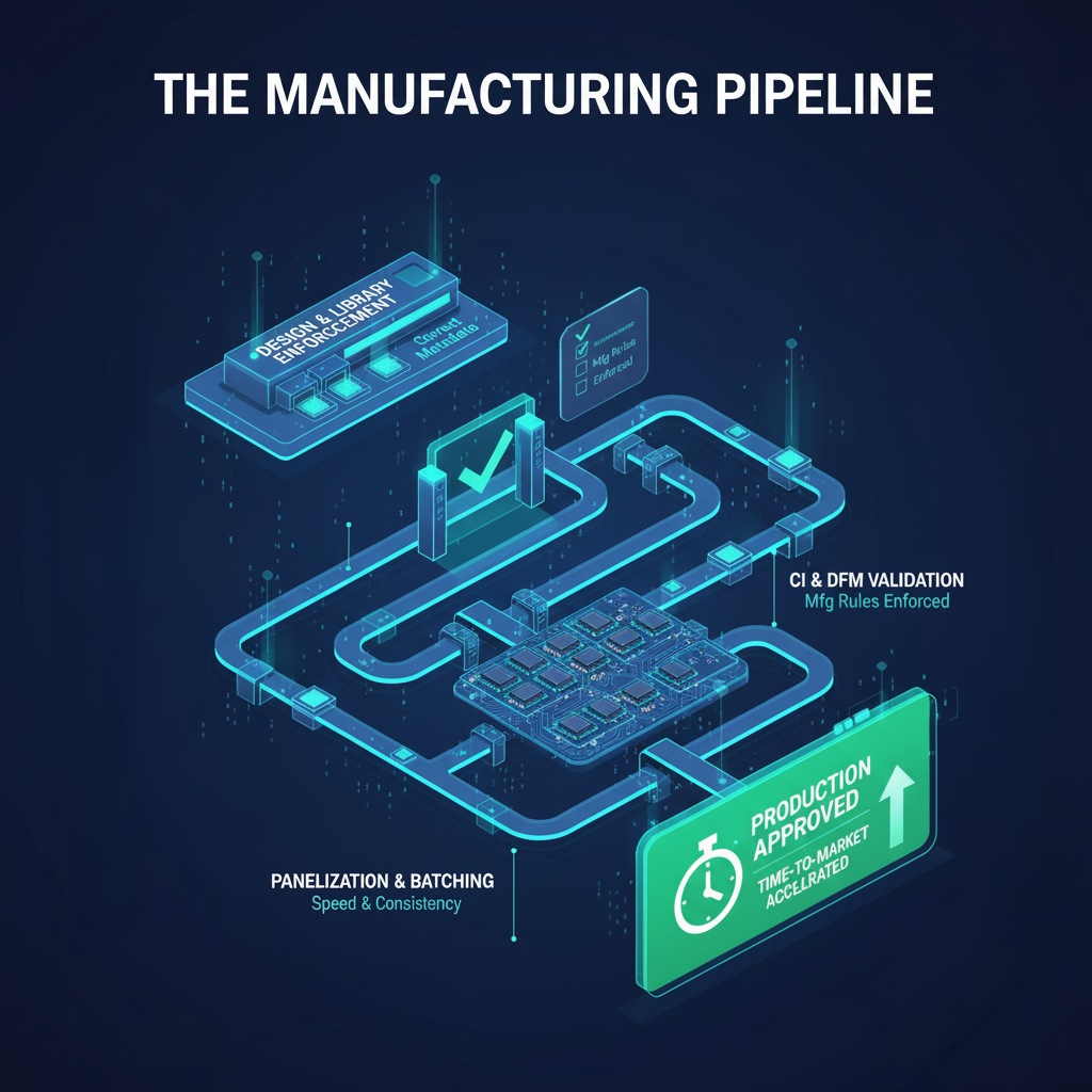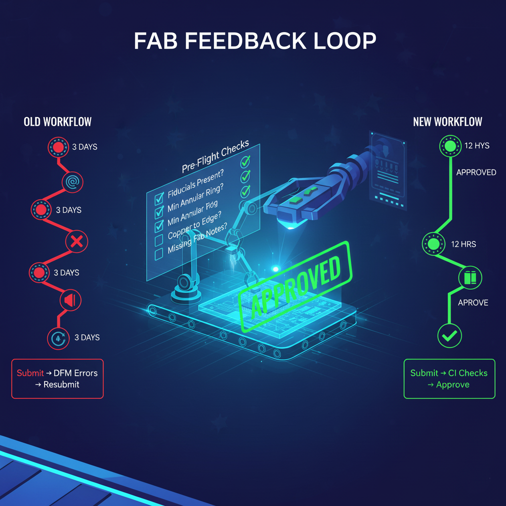 (board spec + stack-up + via rules + impedance targets) - Pre-flight checks integrated into CI