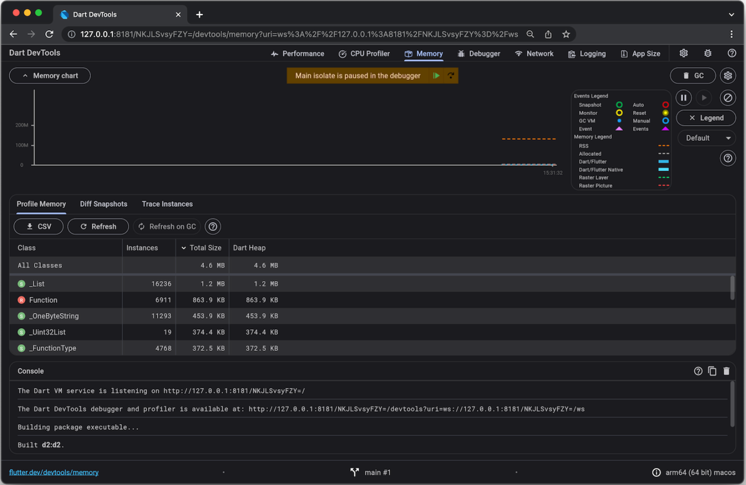 - Flutter frames chart: Visualizes UI and raster thread activity, showing how long each frame takes to render.