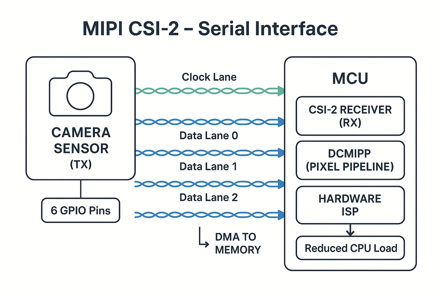 - Pin-count reduction: A 4-lane CSI-2 interface uses 4 data lanes + 1 clock lane (differential pairs) – roughly 6 GPIOs compared to ~17 in DCMI.