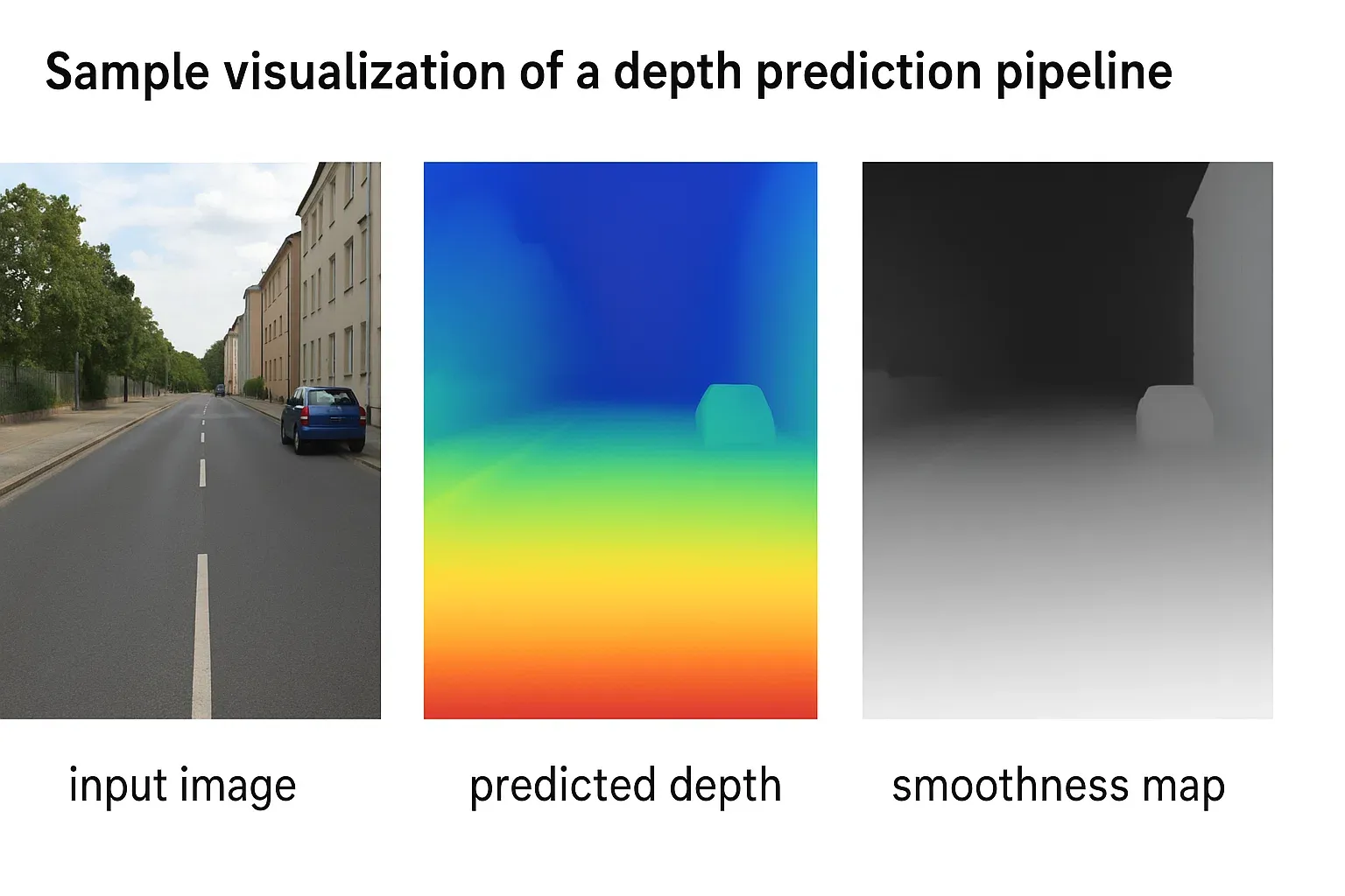 - The second term (|∇D|) is a smoothness loss, encouraging neighboring pixels to have similar depths so that flat surfaces remain smooth.