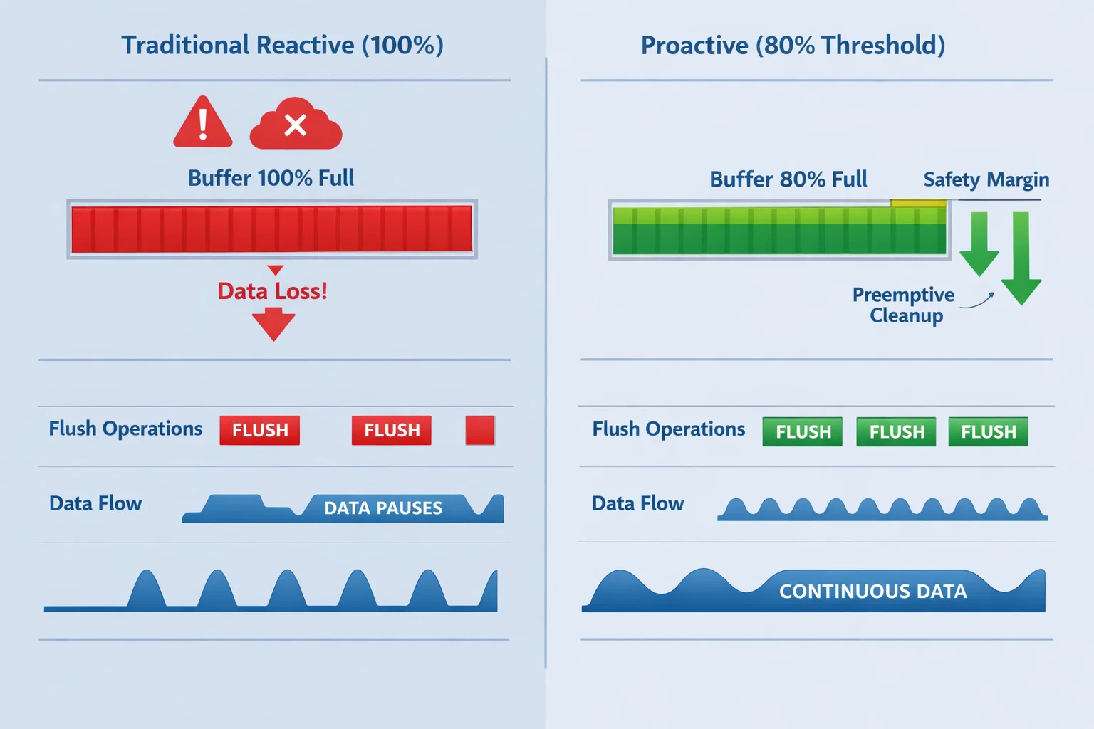 Our solution implements predictive buffer flushing at the 80% capacity mark, providing a safety margin that accounts for real-world system behavior and hardware limitations.