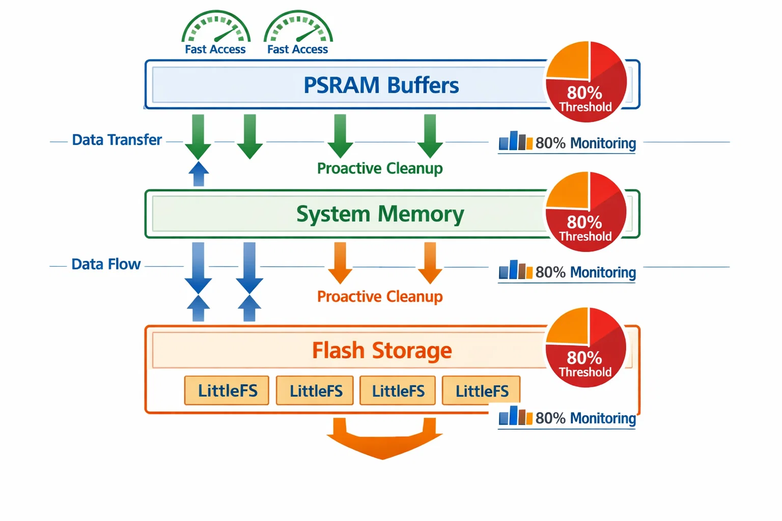 PSRAM and system memory monitoring with proactive cleanup triggers. The system continuously tracks memory usage and initiates cleanup operations before critical thresholds are reached.