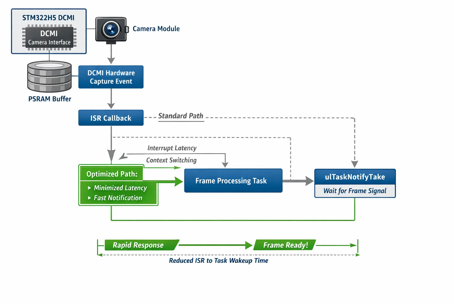 In our camera system, frame capture completion uses direct notifications to minimize ISR latency:
