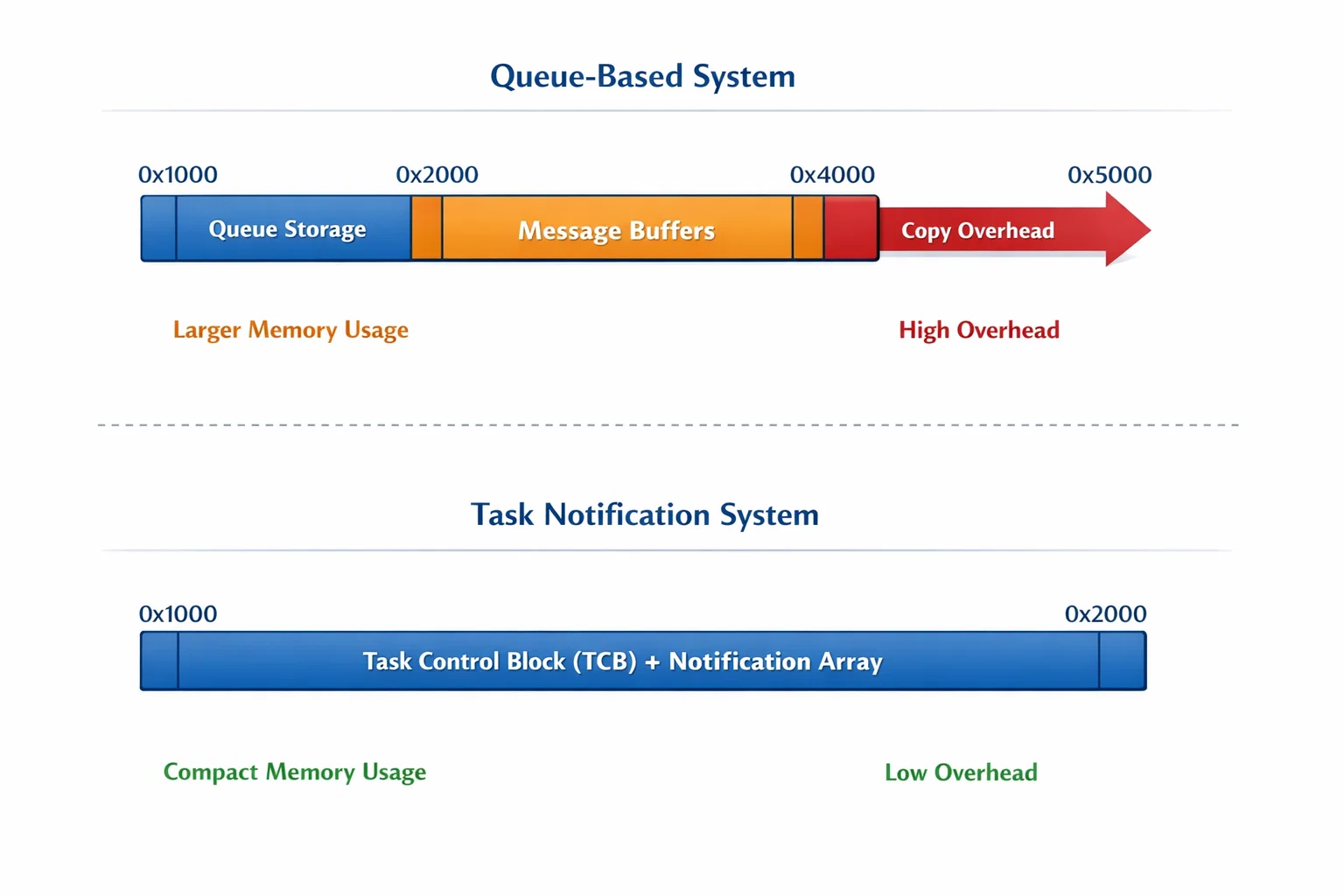 The memory savings become substantial in systems with multiple communication channels. A typical sensor processing pipeline might require 10-15 communication paths, where queues consume 1.6KB while notifications use zero additional memory.