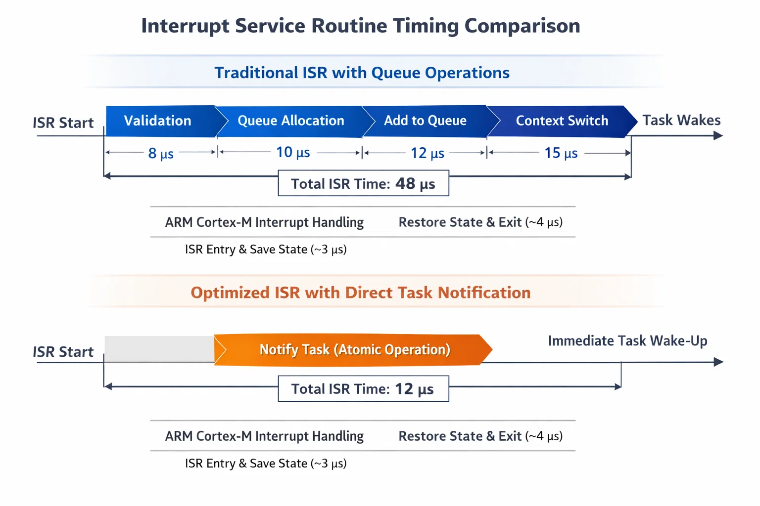 Task notifications excel in interrupt-driven scenarios. Traditional queue operations from ISR context require additional validation and may trigger longer context switches. Direct notifications use optimized ISR primitives: