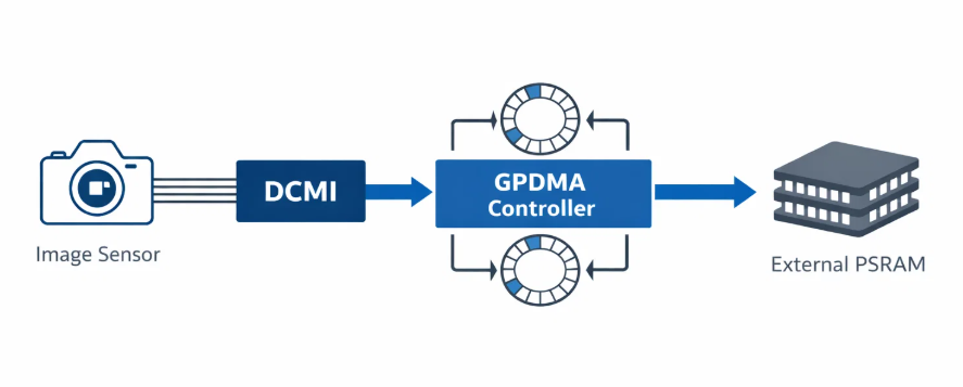 The solution centers around a sophisticated DMA ring buffer architecture that eliminates CPU intervention during capture operations. The system uses STM32H5's General Purpose DMA (GPDMA) with linked-list mode for seamless buffer management.