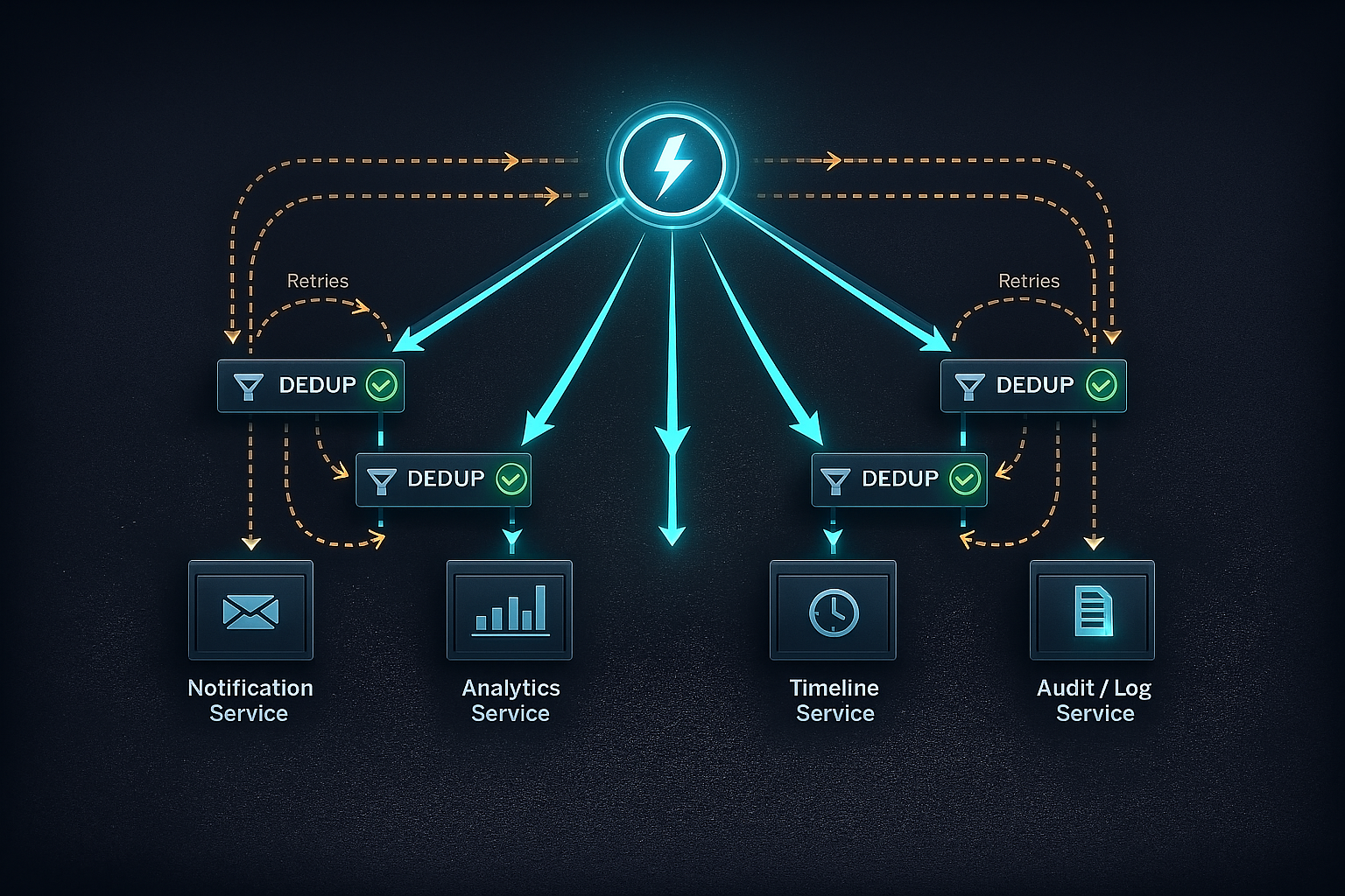 To contain this, fan-out must be treated as a chain of idempotent operations rather than a single fire-and-forget step. Each downstream consumer must independently enforce deduplication based on stable identifiers.