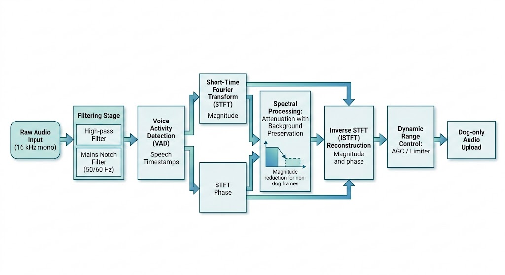 At Hoomanely, this is handled directly in the edge audio pipeline by producing a privacy-first dog-only audio stream before upload. The implementation uses speech activity detection plus spectral attenuation so human voice energy is reduced while non-speech acoustic structure is preserved. This post breaks down the practical design: what problem we solved, why we chose this approach, how the signal processing works frame-by-frame, and what engineering tradeoffs matter if you want to replicate it.