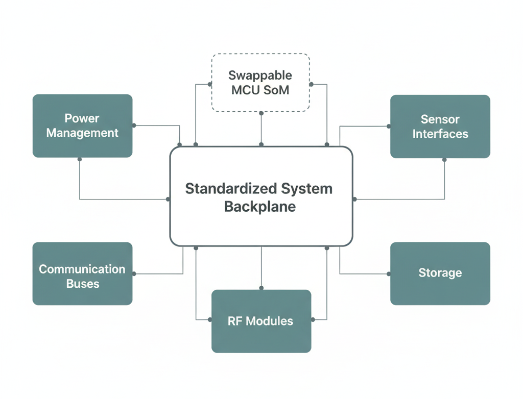 When we need to work with a different MCU family, only the System-on-Module (SoM) section changes. Everything else—the power supply design, sensor interfaces, peripheral connections—stays identical.