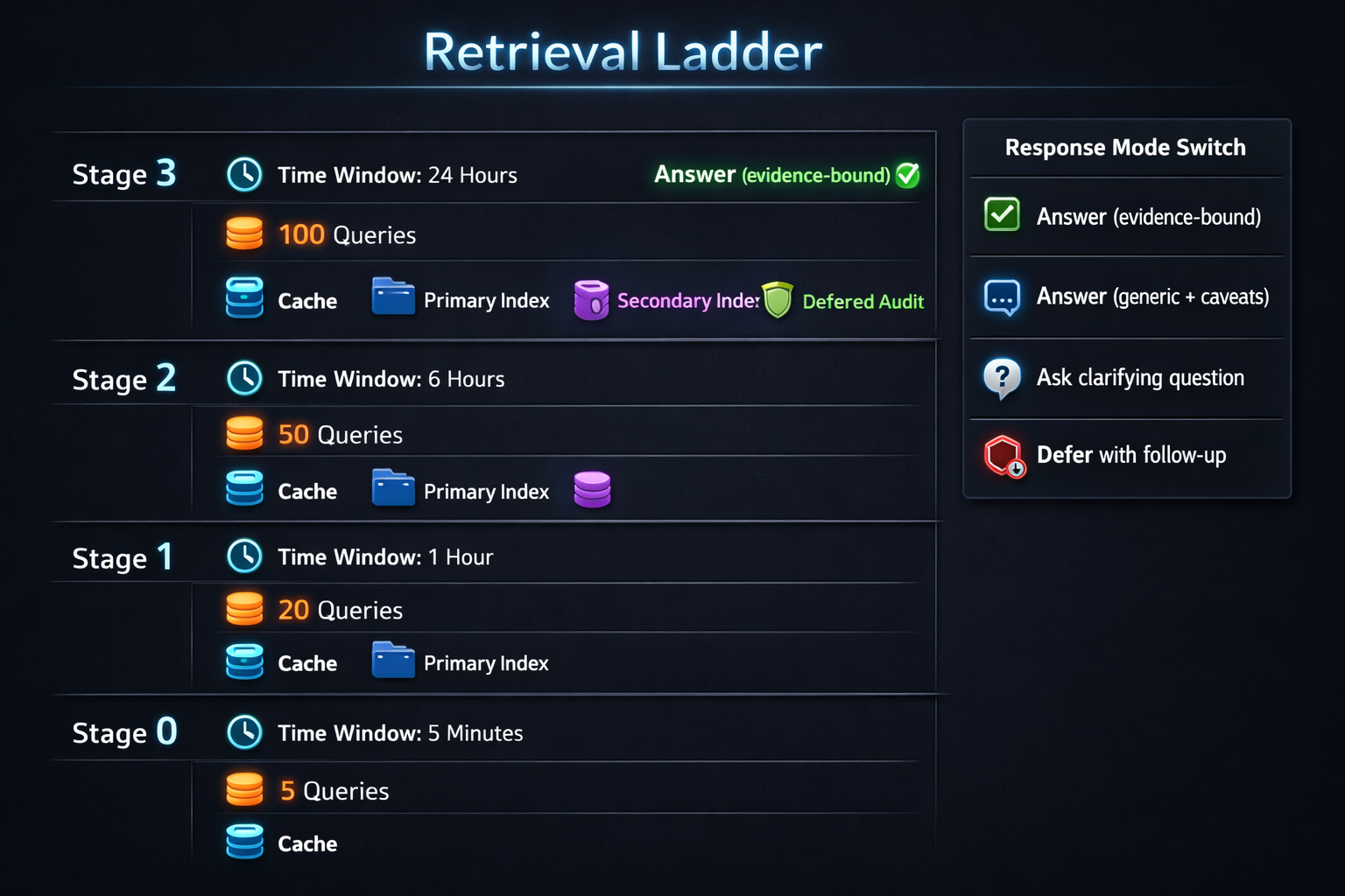 - Stage 3 (350ms+): deferred retrieval (async follow-up), deep audit mode