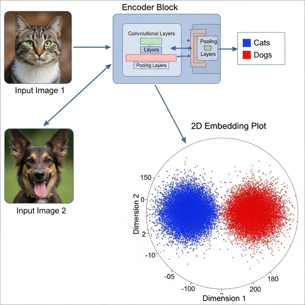 An embedding model transforms an image into a compact vector (often 128–1024 dimensions). Popular architectures:
