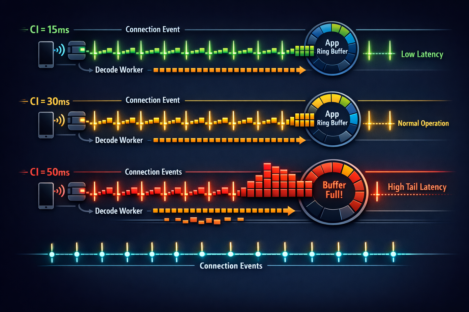 - Short CI (e.g., 7.5–15 ms): more events, lower latency, higher radio duty