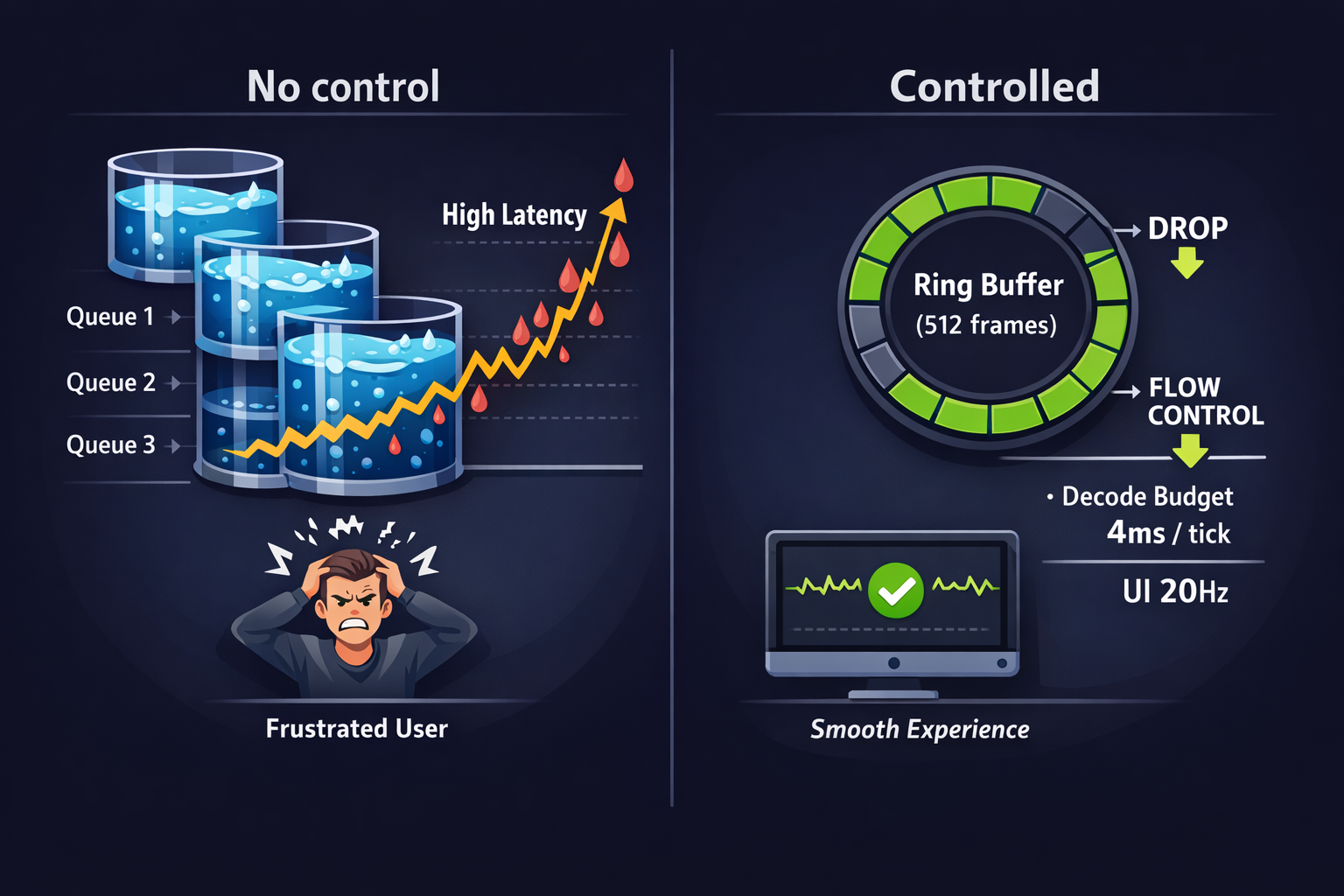 A stable stream is not “max throughput.” It’s controlled throughput with bounded jitter and bounded memory growth.
