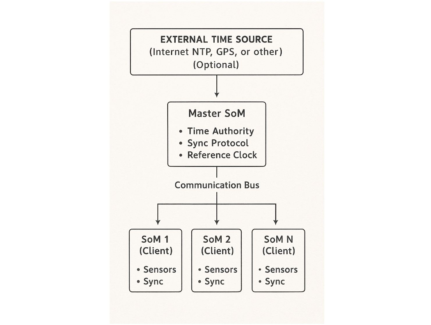 - One SoM designated as master clock (time authority)