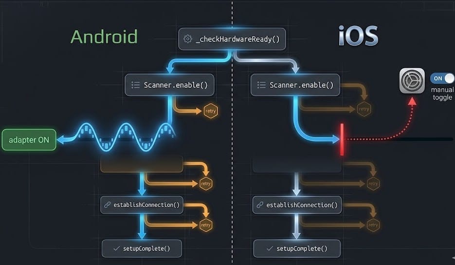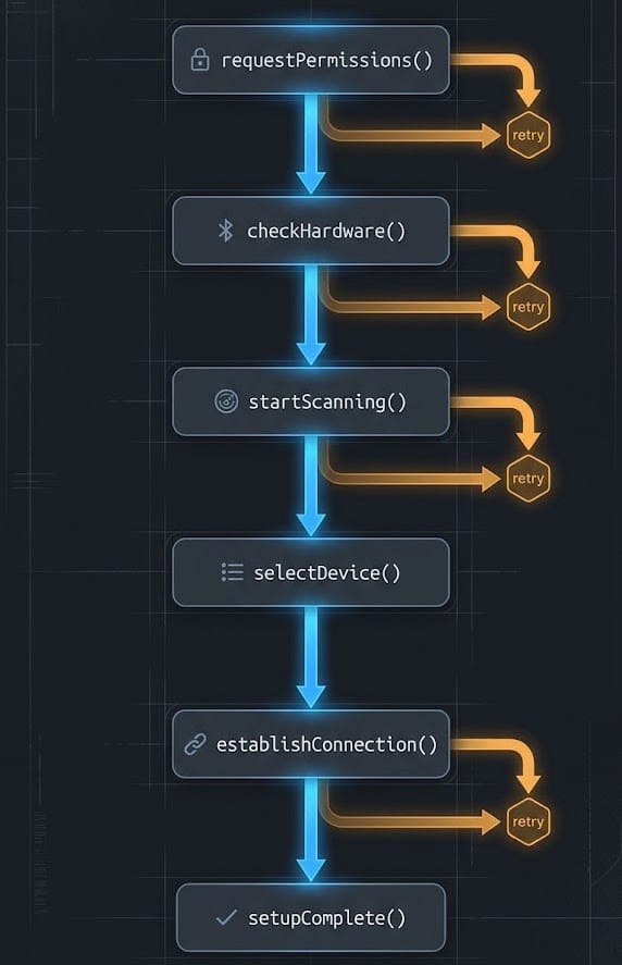 Hardware setup flows are deceptively hard to build well. A Wi-Fi speaker or IoT device might need Bluetooth permissions, adapter readiness, a 10-second scan, device selection, GATT connection, and a service handshake - each of which can fail independently and silently. When you are building this in Flutter, you quickly discover that the problem is not the BLE protocol. It is the state.