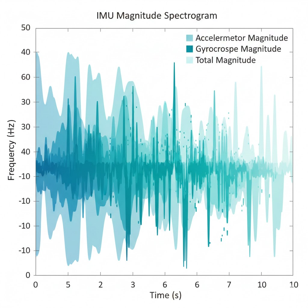 We collect IMU data from a 9-axis sensor (accelerometer + gyroscope + magnetometer), but our first version uses only six channels: (ax, ay, az, gx, gy, gz) sampled at 100–120 Hz on the neck-band.