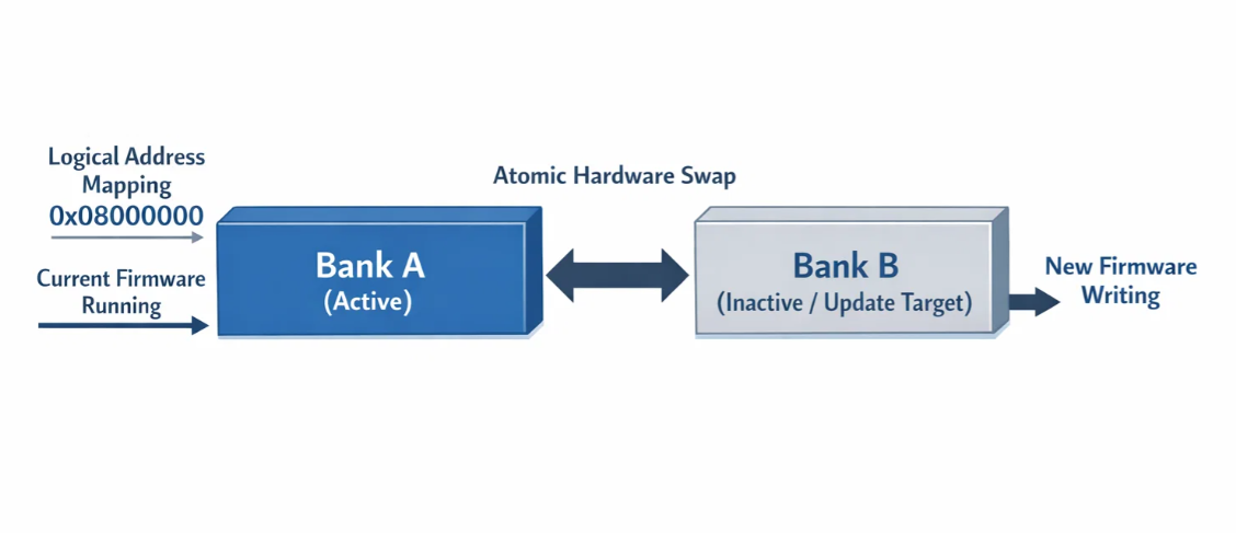 This hardware abstraction ensures that update logic remains consistent regardless of the current bank configuration, while the underlying hardware provides the safety guarantees necessary for field deployment.