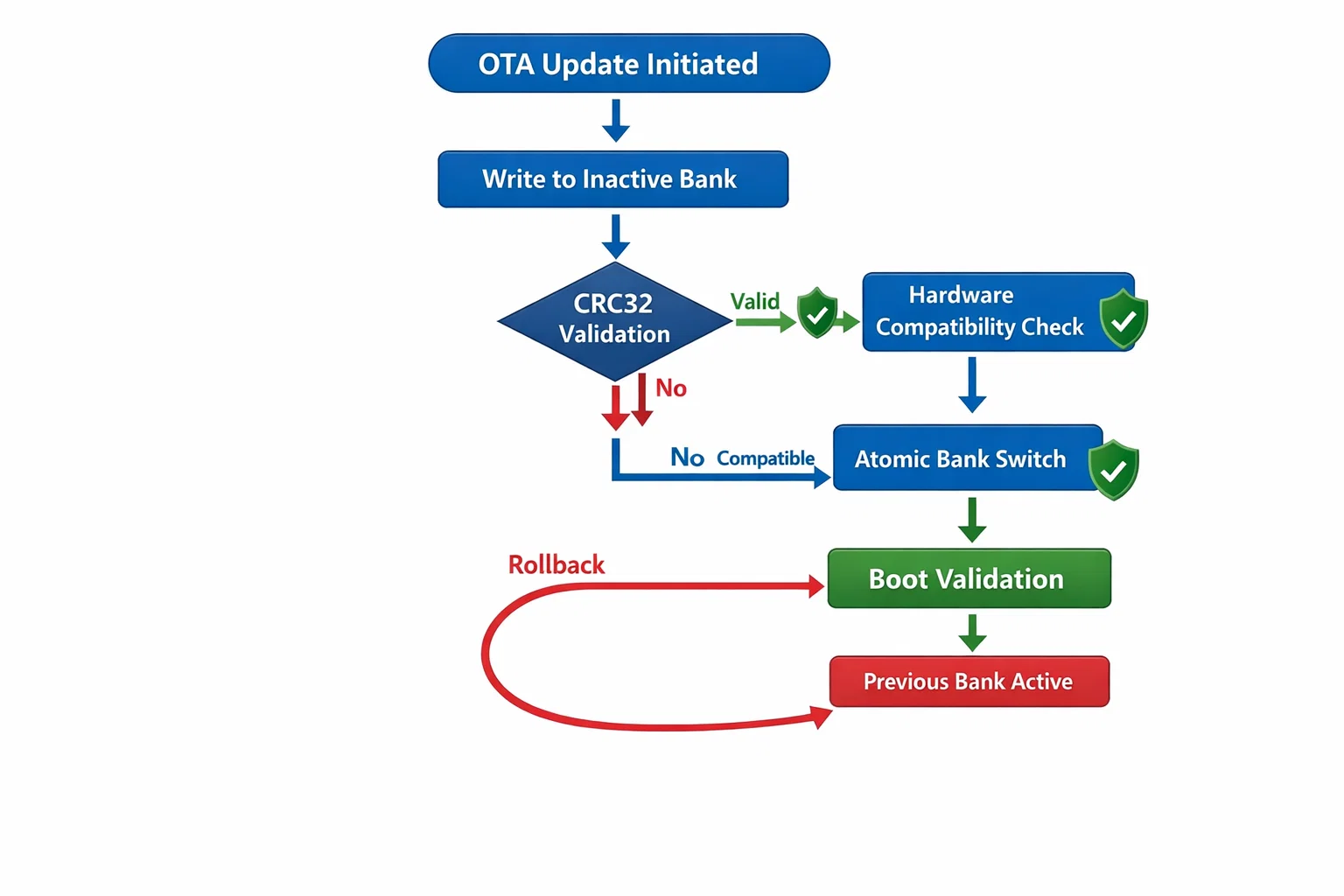 The foundation of our brick-proof approach lies in dual-bank flash architecture available in advanced microcontrollers. This hardware feature provides two complete flash banks, allowing one bank to remain active while updates are written to the alternate bank. The key innovation lies in how we leverage the hardware bank swapping mechanism to achieve atomic updates.