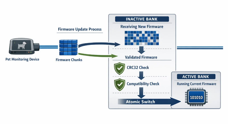 The challenge of safe firmware updates becomes critical when devices operate in remote locations without technical support. A single corrupted update could render a pet monitoring system inoperable, potentially missing crucial health events. This reality drove our engineering team to develop what we call a "brick-proof" bootloader architecture, achieving zero field failures across thousands of over-the-air updates.