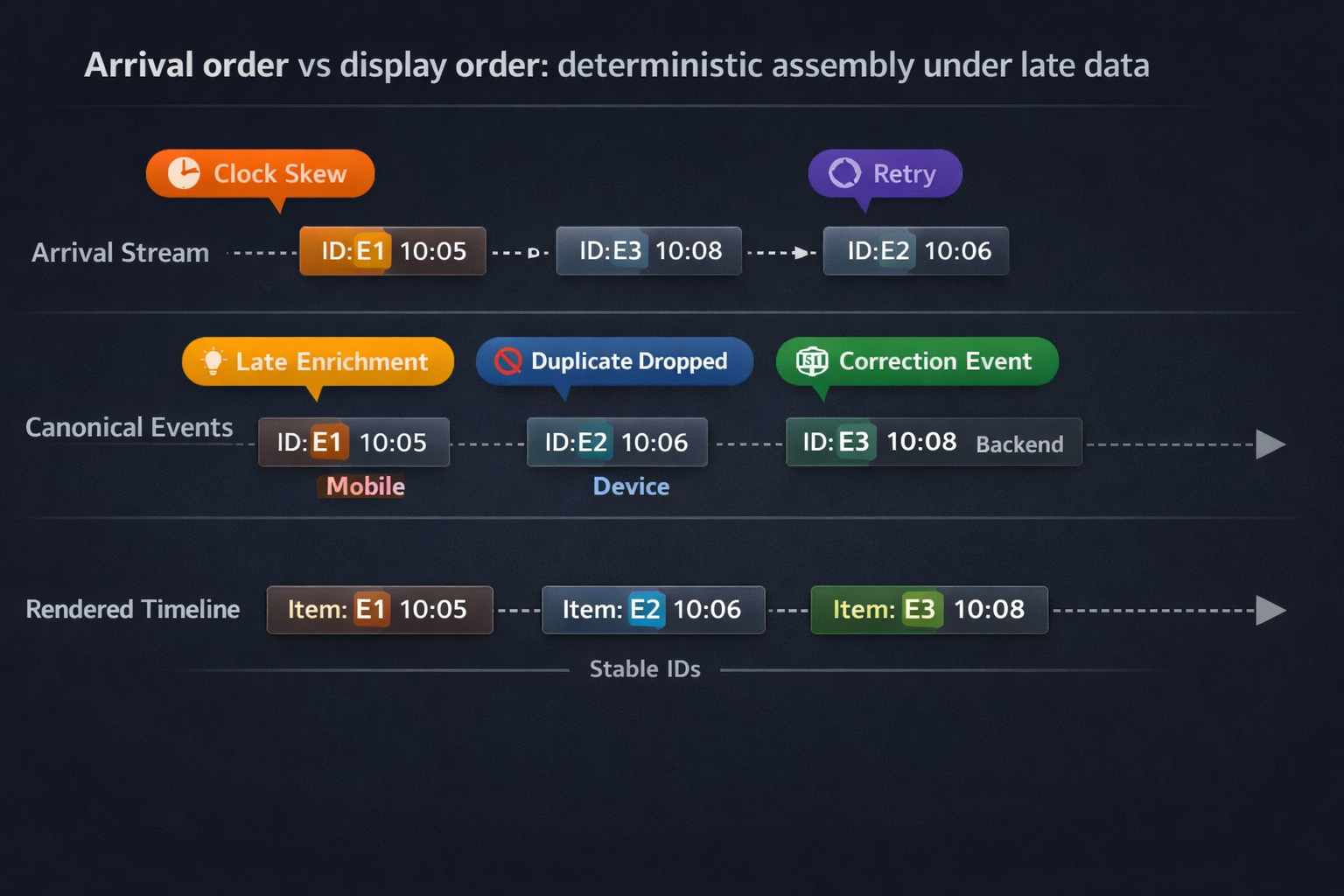 If each consumer assembles these differently (mobile app, web app, analytics export), your timeline becomes inconsistent by surface. Users notice. The infrastructure approach has one goal: make “what the user sees” a deterministic function of inputs, regardless of arrival order or partial failure.