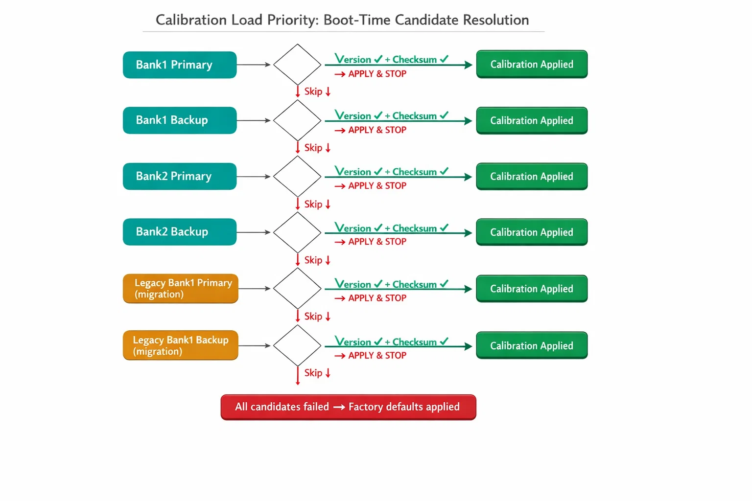 A boot after calibration finds Bank1-Primary valid and applies it in under 1 ms.