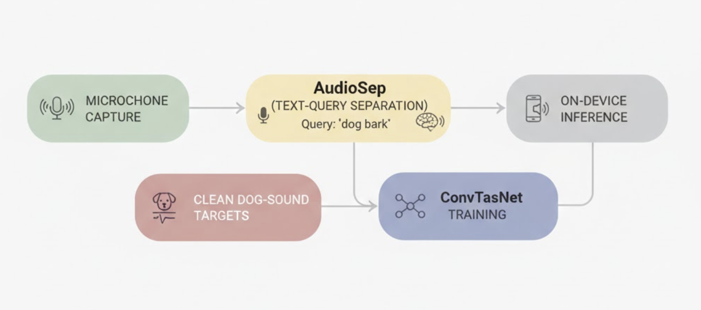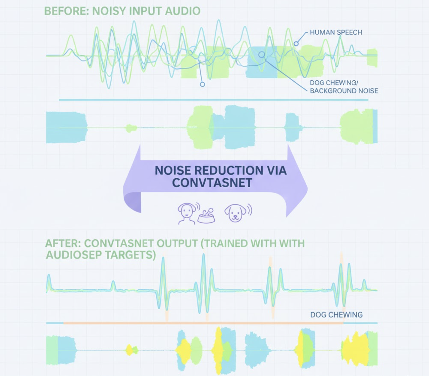 This pushed us toward a more modern and precise approach: a two-stage learning-based noise-cancellation pipeline where a transformer separation model (AudioSep) becomes the teacher, and a lightweight ConvTasNet model becomes the student deployed on-device.