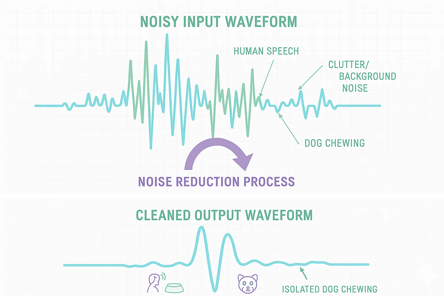 But even during those few seconds, real homes are chaotic acoustic environments: TVs, human conversation, clanking bowls, external noise, and room echo. Traditional DSP filters or Mel-band masking help somewhat, but they still leak speech and suppress the subtle transients we care about (chewing spikes, micro-gulps, lapping patterns).