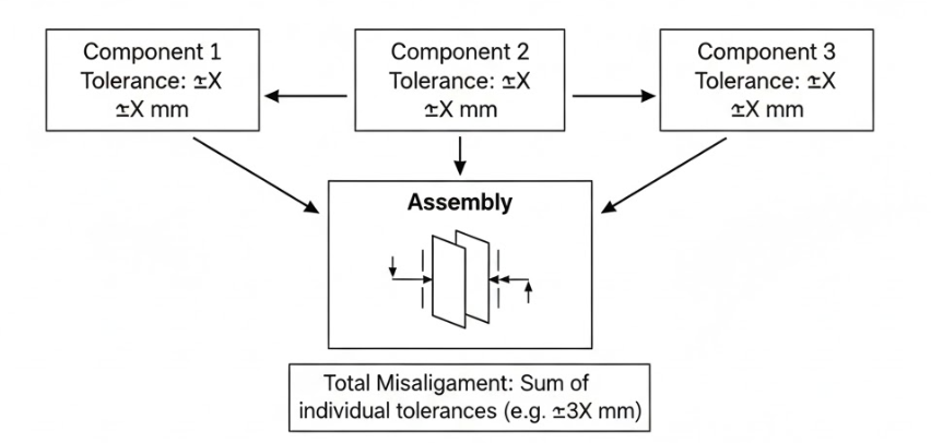 Diagram showing multiple components with individual tolerances combining into cumulative misalignment.