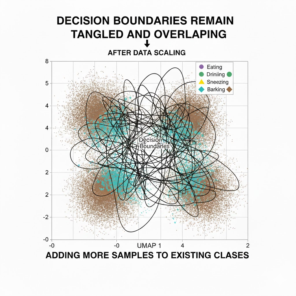 In the sliding-window setup, most inference windows were dominated by silence, background hum, or transitions between events. As more classes were added, these low-information windows started pulling class boundaries closer together, increasing false positives.