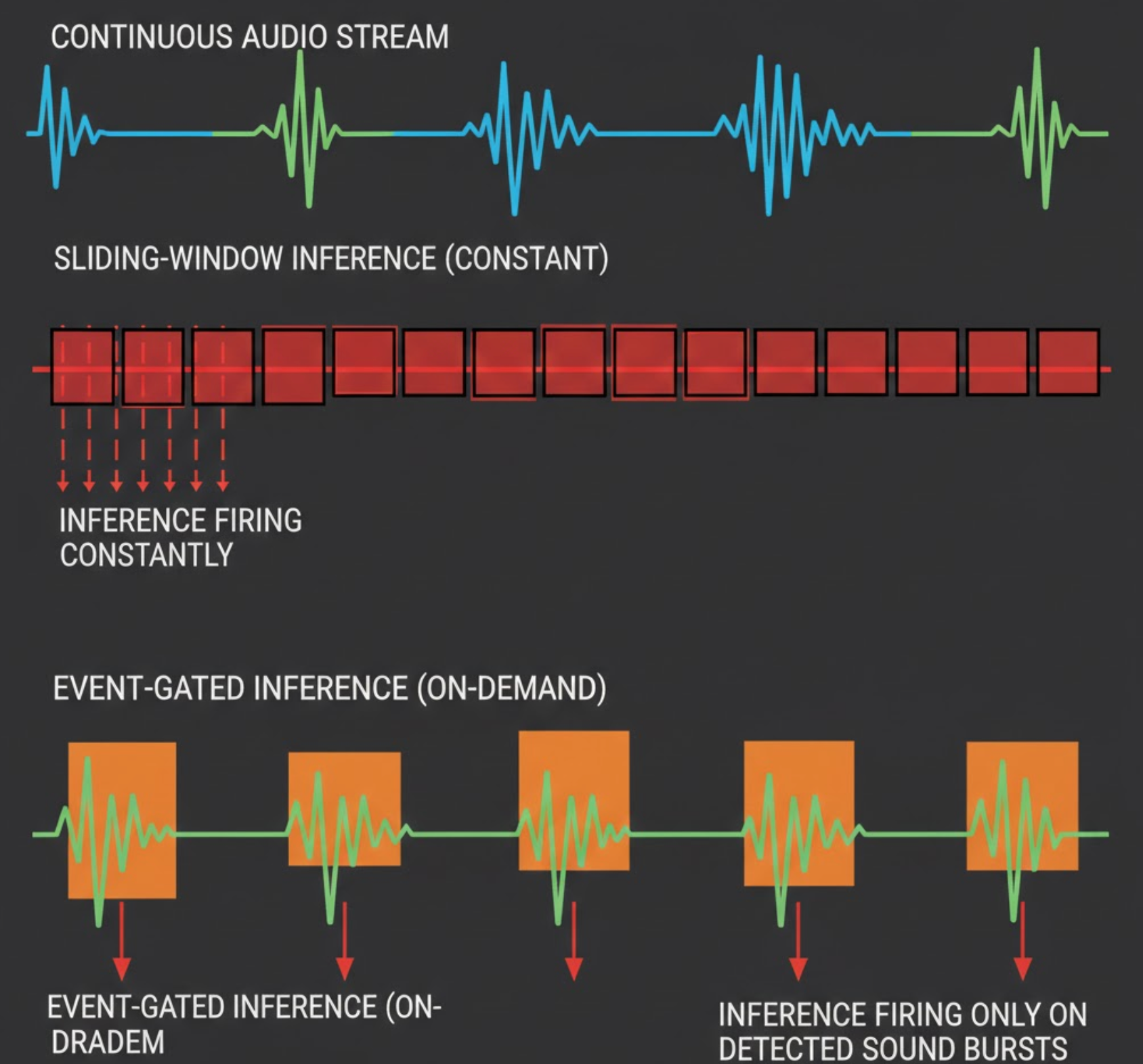We shifted from long sliding windows to event-gated inference, where the model is invoked only when an upstream signal (energy change, spectral flux, VAD, or heuristic trigger) indicates a meaningful acoustic event.