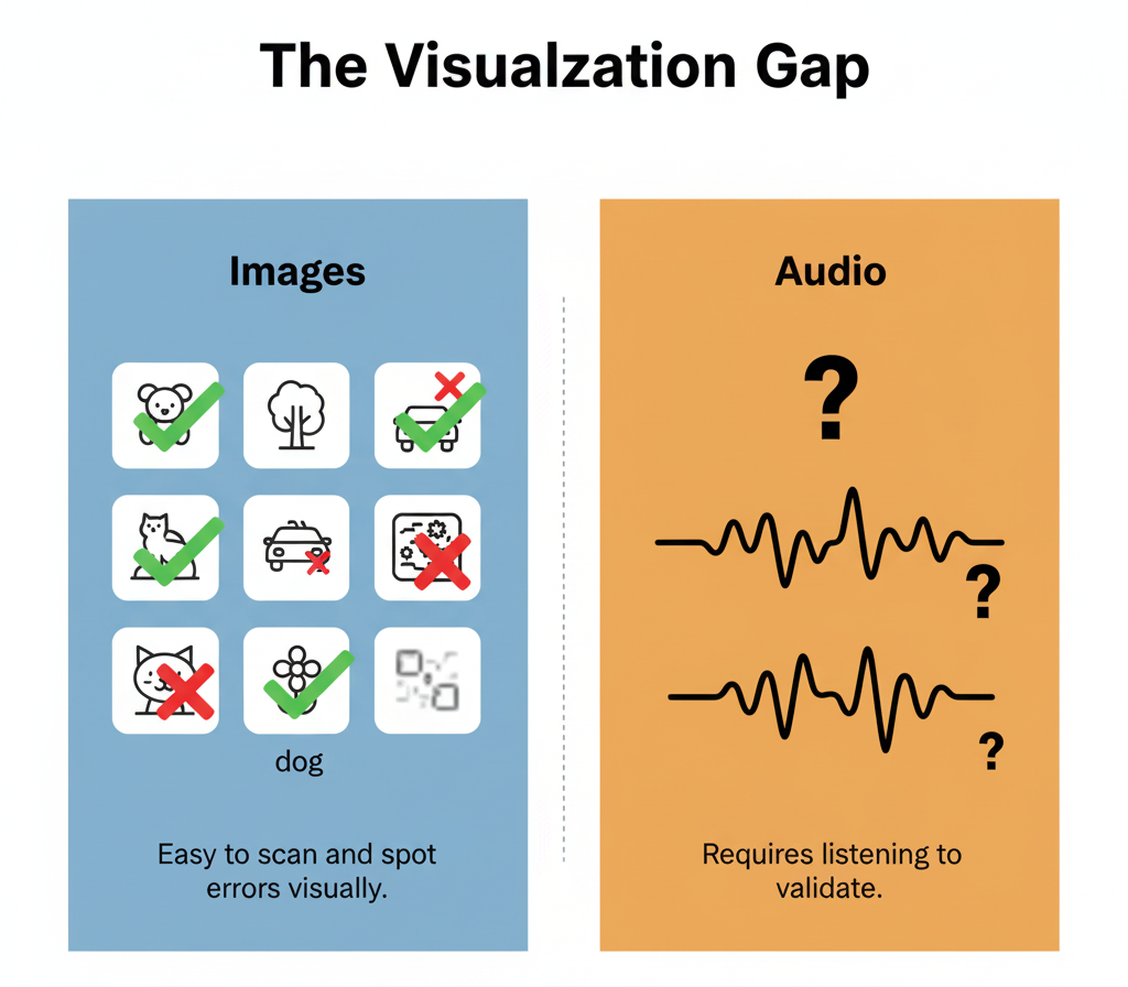 Audio exacerbates this because validation is perceptually expensive. Computer vision engineers can scan grids of labeled images and spot errors in seconds. Audio requires sequential listening. You can't parallelise your perception. Every clip demands focused attention.