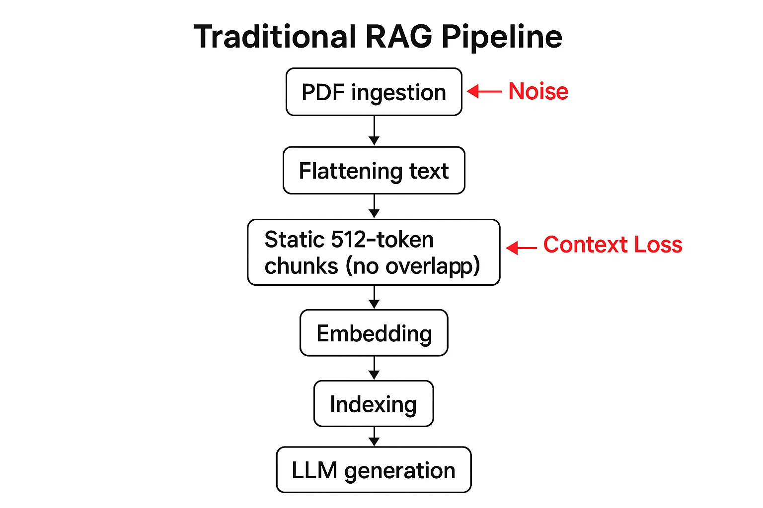 - Noisy and inflexible chunking: We used fixed 512-token blocks with no overlap, keeping messy elements like image placeholders and headers, which diluted content and lost context.